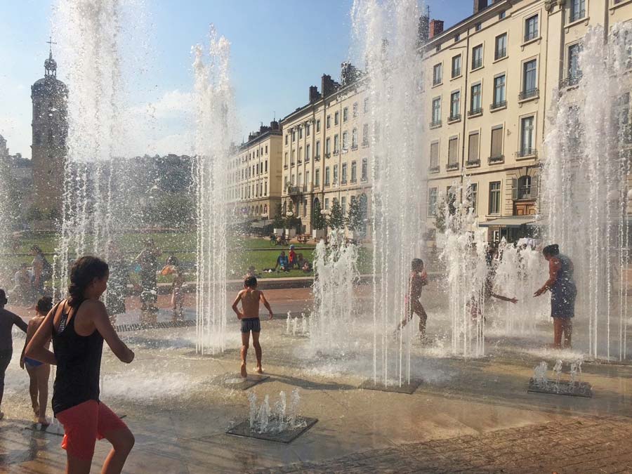 A group of kids cool off and play in a geyser-like fountain park in Geneva, Switzerland.