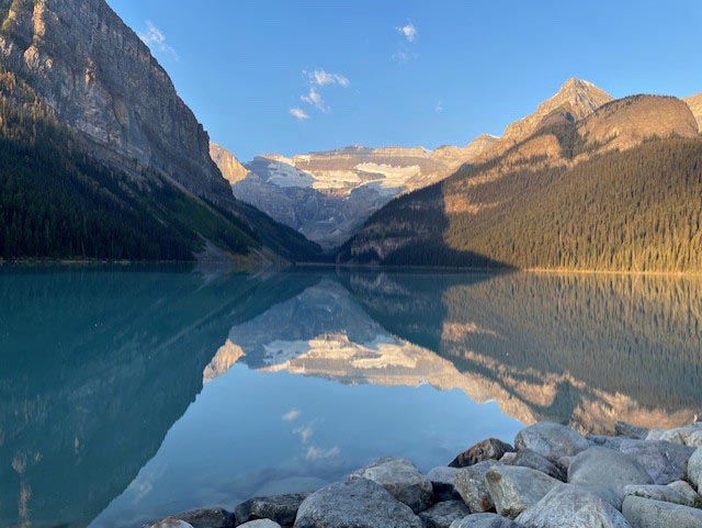 "Mirror, mirror on the lake, is it real or is it fake?" Oh, it's real alright! Lake Louise in Banff, Canada was so still this particular morning that the surrounding landscape cast a mirror-like reflection on the surface of the water. Try turning the image upside down—it's almost identical!
