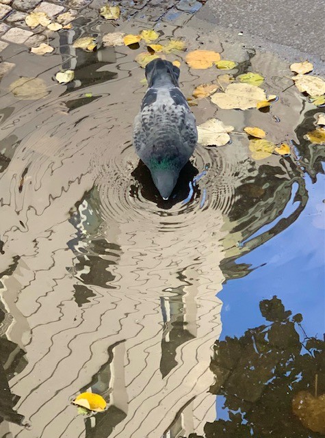 A thirsty pigeon sips from a street puddle in the Old Town shopping district in Prague in the Czech Republic.